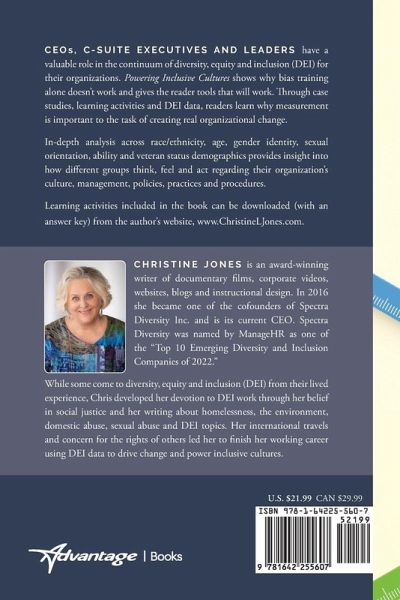 CEOs , C-SUITE EXECUTIVES AND LEADERS have a valuable role in the continuum of diversity, equity and inclusion (DEI) for their organizations. Powering Inclusive Cultures shows why bias training alone doesn't work and gives the reader tools that will work. Through case studies, learning activities and DEI data, readers learn why measurement is important to the task of creating real organizational change. In-depth analysis across race/ethnicity, age, gender identity, sexual orientation, ability and veteran status demographics provides insight into how different groups think, feel and act regarding their organization's culture, management, policies, practices and procedures. Learning activities included in the book can be downloaded (with an answer key) from the author's website, www.christineLjones.com.