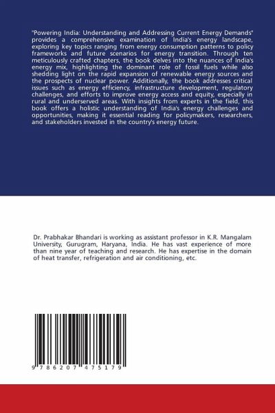 "Powering India: Understanding and Addressing Current Energy Demands" provides a comprehensive examination of India's energy landscape, exploring key topics ranging from energy consumption patterns to policy frameworks and future scenarios for energy transition. Through ten meticulously crafted chapters, the book delves into the nuances of India's energy mix, highlighting the dominant role of fossil fuels while also shedding light on the rapid expansion of renewable energy sources and the prospects of nuclear power. Additionally, the book addresses critical issues such as energy efficiency, infrastructure development, regulatory challenges, and efforts to improve energy access and equity, especially in rural and underserved areas. With insights from experts in the field, this book offers a holistic understanding of India's energy challenges and opportunities, making it essential reading for policymakers, researchers, and stakeholders invested in the country's energy future.
