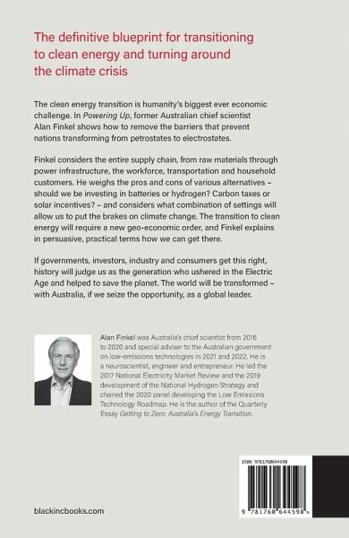 Former chief scientist Alan Finkel shares his compelling insights and expertise and makes the case for Australia leading the way in the global transition to clean energy. The clean energy transition is humanity's biggest ever economic challenge. In Powering Up, former Australian chief scientist Alan Finkel shows how to remove the barriers that prevent nations transforming from petrostate to electrostate. Finkel considers the entire supply chain, from raw materials through power infrastructure, the workforce, transportation and household customers. He reveals the outlines of a new geo-economic order and explains in persuasive, practical terms how we can get there. If governments, investors, industry and consumers get this right over the next three decades, history will judge us as the generation who ushered in the Electric Age and helped to save the planet. The world will be transformed - with Australia, if we seize the opportunity, as a global leader.