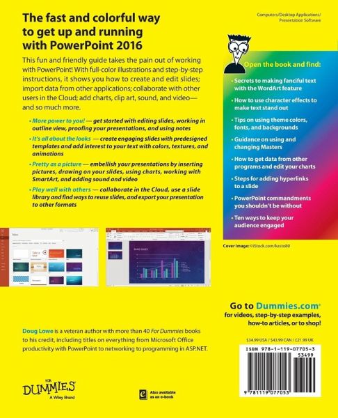 Get up and running with PowerPoint 2016 Does using PowerPoint make you want to pull your hair out? PowerPoint 2016 For Dummies takes the pain out of working with PowerPoint, offering plain-English explanations of everything you need to know to get up and running with the latest version of the software. With full-color illustrations and step-by-step instructions, it shows you how to create and edit slides, import data from other applications, collaborate with other users in the Cloud, add charts, clip art, sound, and video--and so much more. PowerPoint is the world's de facto presentation software, used and supported in over 60 countries. The time has never been better to take advantage of the latest software to make killer PowerPoint presentations. From adding special effects to your presentations to working with master slides and templates, this hands-on friendly guide is the fast and easy way to make PowerPoint work for you. * Presented in full color to better illustrate the powerful presentation features of the software * Helps you take advantage of all of PowerPoint's new features * Available in conjunction with the release of the next version of Microsoft Office * Written by bestselling author Doug Lowe If you're a new or inexperienced PowerPoint user who spends more time trying to figure out how the software works than you do actually working on your presentations, PowerPoint 2016 For Dummies is just what you need to gain back hours of your work day and make professional, impactful presentations.