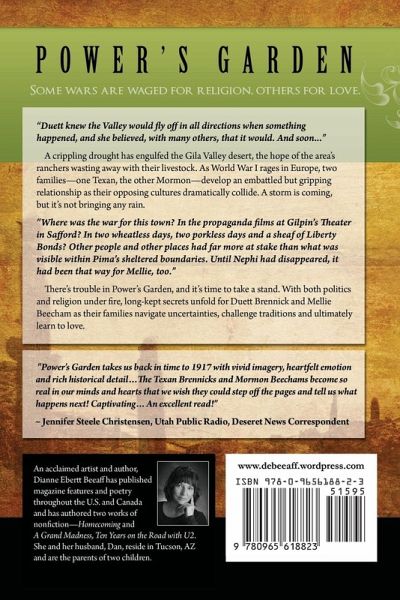 Tragedy and triumph unfurl when a devout Mormon family hires a head-strong young widow during trying economic times. Two families -- one Texan, one Mormon -- develop an embattled but gripping relationship in the Arizona desert, while WWI rages abroad. Long-kept secrets unfold as they challenge tradition and ultimately learn to love. Power's Garden is told from the alternating perspectives of Duett Brennick, a Texan rancher, and Malvina Beecham, a Mormon school teacher.