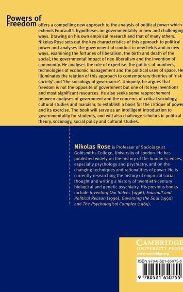 Powers of Freedom, first published in 1999, offers a compelling approach to the analysis of political power which extends Foucault's hypotheses on governmentality in challenging ways. Nikolas Rose sets out the key characteristics of this approach to political power and analyses the government of conduct. He analyses the role of expertise, the politics of numbers, technologies of economic management and the political uses of space. He illuminates the relation of this approach to contemporary theories of 'risk society' and 'the sociology of governance'. He argues that freedom is not the opposite of government but one of its key inventions and most significant resources. He also seeks some rapprochement between analyses of government and the concerns of critical sociology, cultural studies and Marxism, to establish a basis for the critique of power and its exercise. The book will be of interest to students and scholars in political theory, sociology, social policy and cultural studies.