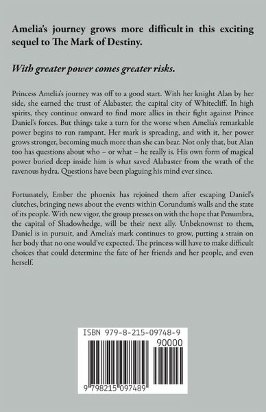 Amelia's journey grows more difficult in this exciting sequel to The Mark of Destiny. With greater power comes greater risks. Princess Amelia's journey was off to a good start. With her knight Alan by her side, she earned the trust of Alabaster, the capital city of Whitecliff. In high spirits, they continue onward to find more allies in their fight against Prince Daniel's forces. But things take a turn for the worse when Amelia's remarkable power begins to run rampant. Her mark is spreading, and with it, her power grows stronger, becoming much more than she can bear. Not only that, but Alan too has questions about who - or what - he really is. His own form of magical power buried deep inside him is what saved Alabaster from the wrath of the ravenous hydra. Questions have been plaguing his mind ever since. Fortunately, Ember the phoenix has rejoined them after escaping Daniel's clutches, bringing news about the events within Corundum's walls and the state of its people. With new vigor, the group presses on with the hope that Penumbra, the capital of Shadowhedge, will be their next ally. Unbeknownst to them, Daniel is in pursuit, and Amelia's mark continues to grow, putting a strain on her body that no one would've expected. The princess will have to make difficult choices that could determine the fate of her friends and her people, and even herself.