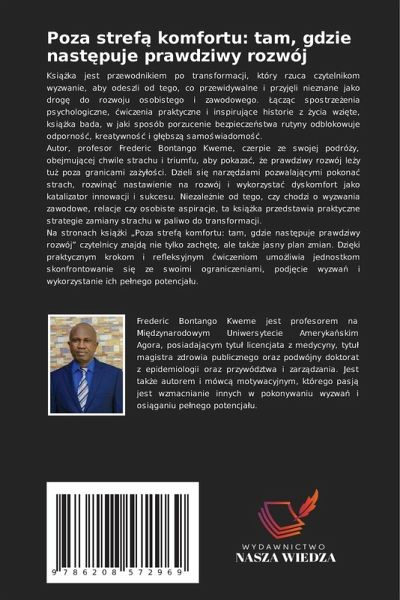 Ksi¿¿ka jest przewodnikiem po transformacji, który rzuca czytelnikom wyzwanie, aby odeszli od tego, co przewidywalne i przyj¿li nieznane jako drog¿ do rozwoju osobistego i zawodowego. ¿¿cz¿c spostrze¿enia psychologiczne, ¿wiczenia praktyczne i inspiruj¿ce historie z ¿ycia wzi¿te, ksi¿¿ka bada, w jaki sposób porzucenie bezpiecze¿stwa rutyny odblokowuje odporno¿¿, kreatywno¿¿ i g¿¿bsz¿ samo¿wiadomo¿¿.Autor, profesor Frederic Bontango Kweme, czerpie ze swojej podró¿y, obejmuj¿cej chwile strachu i triumfu, aby pokazä, ¿e prawdziwy rozwój le¿y tu¿ poza granicami zäy¿o¿ci. Dzieli si¿ narz¿dziami pozwalaj¿cymi pokonä strach, rozwin¿¿ nastawienie na rozwój i wykorzystä dyskomfort jako katalizator innowacji i sukcesu. Niezale¿nie od tego, czy chodzi o wyzwania zawodowe, relacje czy osobiste aspiracje, ta ksi¿¿ka przedstawia praktyczne strategie zamiany strachu w paliwo do transformacji.Na stronach ksi¿¿ki "Poza stref¿ komfortu: tam, gdzie nast¿puje prawdziwy rozwój" czytelnicy znajd¿ nie tylko zach¿t¿, ale tak¿e jasny plan zmian. Dzi¿ki praktycznym krokom i refleksyjnym ¿wiczeniom umo¿liwia jednostkom skonfrontowanie si¿ ze swoimi ograniczeniami, podj¿cie wyzwä i wykorzystanie ich pe¿nego potencjäu.