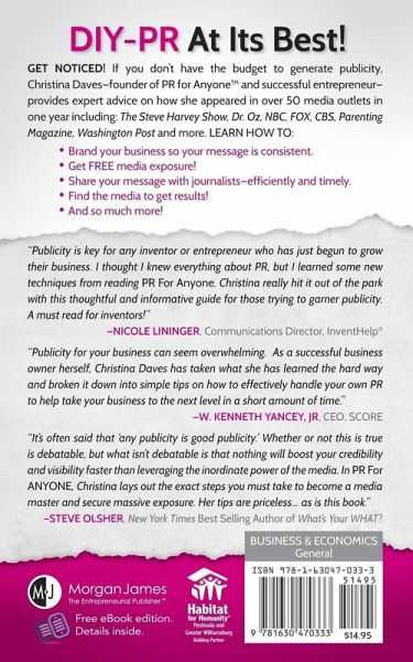 Christina Daves is a serial entrepreneur and award-winning inventor who founded "PR for Anyone." With no resources to promote her business, CastMedic Designs, she taught herself everything she could about PR to handle it herself. She had no experience in PR and no contacts in the industry but ended up appearing in over 50 media outlets (including national and local television, magazines, and radio) in her first year of business. From Steve Harvey and Dr. Oz to local affiliates of NBC, CBS, FOX, and the CW, to national publications like Parenting and Washington Post, Christina has been able to secure appearances in many major media outlets.