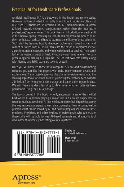 Artificial Intelligence (AI) is a buzzword in the healthcare sphere today. However, notions of what AI actually is and how it works are often not discussed. Furthermore, information on AI implementation is often tailored towards seasoned programmers rather than the healthcare professional/beginner coder. This book gives an introduction to practical AI in the medical sphere, focusing on real-life clinical problems, how to solve them with actual code, and how to evaluate the efficacy of those solutions. You'll start by learning how to diagnose problems as ones that can and cannot be solved with AI. You'll then learn the basics of computer science algorithms, neural networks, and when each should be applied. Then you'll tackle the essential parts of basic Python programming relevant to data processing and making AI programs. The Tensorflow/Keras library along with Numpy and Scikit-Learn are covered as well.