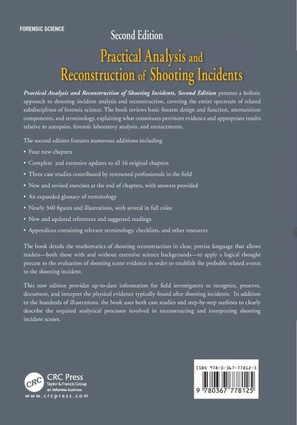 Terminology: Its Use and Abuse-"The Devil Is in the Details." Shooting Reconstruction Myth Busters. Theory and Practice of Shooting Reconstruction. Mathematics of Shooting Reconstruction. Firearms and Ammunition Components. Shooting Reconstruction Equipment and Its Use. Smart Phone/Pad Apps for Shooting Reconstruction. Cartridge Case Ejection Pattern Testing for Semiautomatics. Shotgun Pattern Testing and Evidence Evaluation. Examination/Testing of Weapons and Ammunition Components. Gunshot Residue Testing. Bullet Hole and Wound Characteristics. Bullet Ricochet Phenomena. Bloodstains and Blood Spatter at Shooting Scenes. Officer-Involved Shootings. Case Analysis. Ballistics. Firearm/Ammunition Reference Collections, Databases, and Software. Report Writing, Demonstrative Evidence, and Courtroom Presentation. Maximizing Crime Laboratory Results. Glossary. Appendices.