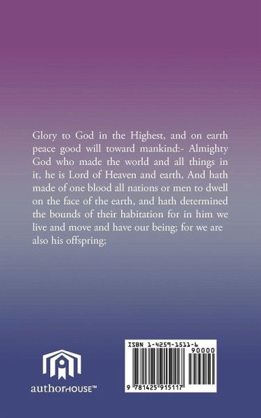 Glory to God in the Highest, and on earth peace good will toward mankind:- Almighty God who made the world and all things in it, he is Lord of Heaven and earth, And hath made of one blood all nations or men to dwell on the face of the earth, and hath determined the bounds of their habitation for in him we live and move and have our being; for we are also his offspring;