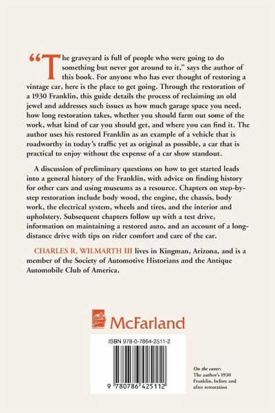 ""The graveyard is full of people that were going to do something, but never got around to it,"" says the author of this book. For anyone who has ever thought restoring a vintage car would be an enjoyable way to spend time, this book is the place to get going. Through the restoration of a 1930 Franklin, it details the step-by-step process of reclaiming an old jewel. It also addresses such issues as how much garage space you need, how long restoration takes, whether you should farm out some of the work, what kind of car you should get, where you can find it, and whether you should stay married. The author uses his 1930 Franklin as an example of restoring a vehicle that is roadworthy in today's traffic yet as original as possible, a car that is practical to enjoy without the expense of a car show standout. A discussion of preliminary questions on how to get started leads into a general history of the Franklin, with advice on finding history for other cars and using museums as a resource. Chapters on step-by-step restoration include body wood, the engine, the chassis, body work, the electrical system, wheels and tires, and the interior and upholstery. Subsequent chapters follow up with a test drive and information on maintaining a restored auto. A chapter on long-distance driving chronicles the author's trip from Arizona to New York with tips on rider comfort and care of the car. It concludes with a chapter on auto clubs in general, a visit to the Franklin Club in New York, and the sale of the author's restored 1930 Franklin.