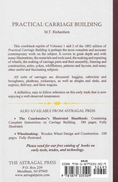 This combined reprint of Volumes 1 and 2 of the 1892 edition of Practical Carriage Building is perhaps the most complete and accurate contemporary work on the subject. It covers in great depth, and with many illustrations, the materials and tools used, the making and repairing of wheels, the making of carriage parts and their assembly, framing and construction, axles, yokes, whiffletrees, patterns and layouts, and many other useful and fascinating subjects. All sorts of carriages are discussed: buggies, cabriolets and broughams, phatons, rockaways, as well as sleighs and sleds, and express, delivery, and farm wagons. A definitive, easy to follow reference on this early trade that is now enjoying a well-deserved renaissance.
