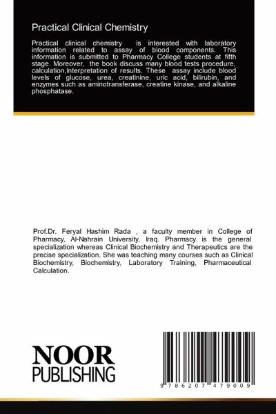 Practical clinical chemistry is interested with laboratory information related to assay of blood components. This information is submitted to Pharmacy College students at fifth stage. Moreover, the book discuss many blood tests procedure, calculation,Interpretation of results. These assay include blood levels of glucose, urea, creatinine, uric acid, bilirubin, and enzymes such as aminotransferase, creatine kinase, and alkaline phosphatase.