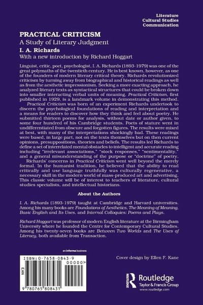 Linguist, critic, poet, psychologist, I. A. Richards (1893-1979) was one of the great polymaths of the twentieth century. He is best known, however, as one of the founders of modern literary critical theory. Richards revolutionized criticism by turning away from biographical and historical readings as well as from the aesthetic impressionism. Seeking a more exacting approach, he analyzed literary texts as syntactical structures that could be broken down into smaller interacting verbal units of meaning. Practical Criticism, first published in 1929, is a landmark volume in demonstrating this method.Practical Criticism was born of an experiment Richards undertook to discern the psychological foundations of reading and interpretation and a means for readers to discover how they think and feel about poetry. He submitted thirteen poems for analysis, without date or author given, to some four hundred of his Cambridge students. Poets of stature went in undifferentiated from obscure and forgotten figures. The results were mixed at best, with many of the interpretations shockingly bad. These readings were based, in large part, not on the texts themselves but on then-current opinions, presuppositions, theories, and beliefs. The results led Richards to define a set of interrelated mental obstacles to intelligent and accurate reading including "irrelevant associations," "stock responses," "sentimentality," and a general misunderstanding of the purpose or "doctrine" of poetry.Richards' concerns in Practical Criticism went well beyond the merely formal. In the humanist tradition, he believed that the ability to read critically and use language truthfully was culturally regenerative, a necessary skill in the modern world of mass-produced art and advertising. This classic volume will be of interest to teachers of literature, cultural studies specialists, and intellectual historians.