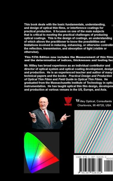 This book deals with the basic fundamentals, understanding, and design of optical thin films, or interference coatings for practical production. It focuses on one of the main subjects that is critical to meeting the practical challenges of producing optical coatings. This is the design of coatings, an understanding of which allows the practitioner to know the possibilities and limitations involved in reducing, enhancing, or otherwise controlling the reflection, transmission, and absorption of light (visible or otherwise). This Fifth Edition now includes measurement of index, thickness, and color; the determination of tooling factors; and the programming of Macros, Workbooks, and FilmStar Basic.