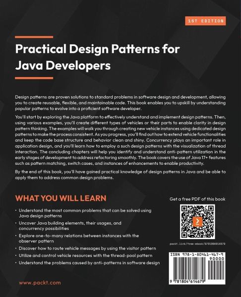 Unravel the power of Java design patterns by learning where to apply them effectively to solve specific software design and development problems Key Features:Decouple logic across objects with dependency injection by creating various vehicles with features Finalize vehicle construction by chaining handlers using the Chain of Responsibility Pattern Plan and execute an advanced vehicle sensor initiation with the Scheduler Pattern Book Description: Design patterns are proven solutions to standard problems in software design and development, allowing you to create reusable, flexible, and maintainable code. This book enables you to upskill by understanding popular patterns to evolve into a proficient software developer. You'll start by exploring the Java platform to understand and implement design patterns. Then, using various examples, you'll create different types of vehicles or their parts to enable clarity in design pattern thinking, along with developing new vehicle instances using dedicated design patterns to make the process consistent. As you progress, you'll find out how to extend vehicle functionalities and keep the code base structure and behavior clean and shiny. Concurrency plays an important role in application design, and you'll learn how to employ a such design patterns with the visualization of thread interaction. The concluding chapters will help you identify and understand anti-pattern utilization in the early stages of development to address refactoring smoothly. The book covers the use of Java 17+ features such as pattern matching, switch cases, and instances of enhancements to enable productivity. By the end of this book, you'll have gained practical knowledge of design patterns in Java and be able to apply them to address common design problems. What You Will Learn:Understand the most common problems that can be solved using Java design patterns Uncover Java building elements, their usages, and concurrency possibilities Optimize a vehicle memory footprint with the Flyweight Pattern Explore one-to-many relations between instances with the observer pattern Discover how to route vehicle messages by using the visitor pattern Utilize and control vehicle resources with the thread-pool pattern Understand the penalties caused by anti-patterns in software design Who this book is for: If you are an intermediate-level Java developer or software architect looking to learn the practical implementation of software design patterns in Java, then this book is for you. No prior knowledge of design patterns is required, but an understanding of Java programming is necessary.