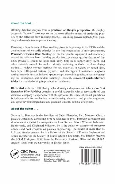 Outline proven methods from planning and manufacture to product testing, this work reports on the most effective means of producing plastics by the extrusion blow moulding process. It supplies data on materials, performance standards and testing methodologies developed in industry with proven reliability and cost effectiveness.