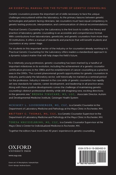 McKinsey L. Goodenberger, MS, CGC, is a Genetic Counselor in the Department of Laboratory Medicine and Pathology at the Mayo Clinic in Rochester, MN. Brittany C. Thomas, MS, CGC, is a Genetic Counselor Supervisor in the Department of Laboratory Medicine and Pathology at the Mayo Clinic in Rochester, MN. Teresa Kruisselbrink, MS, CGC, is a Genetic Counselor Supervisor at the Mayo Clinic's Center for Individualized Medicine in Rochester, MN. Together the editors have more than 40 years' experience in genetic counseling.