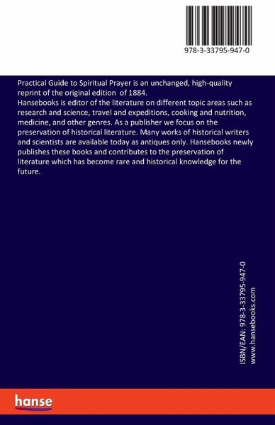 Practical Guide to Spiritual Prayer is an unchanged, high-quality reprint of the original edition of 1884. Hansebooks is editor of the literature on different topic areas such as research and science, travel and expeditions, cooking and nutrition, medicine, and other genres. As a publisher we focus on the preservation of historical literature. Many works of historical writers and scientists are available today as antiques only. Hansebooks newly publishes these books and contributes to the preservation of literature which has become rare and historical knowledge for the future.