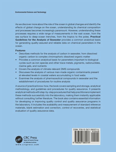 A practical resource, this book covers sampling and storage, description of analytical methodology, and guidelines and procedures for quality assurance. It presents analytical methods with step-by-step procedures to help practitioners implement these methods in the laboratory, making them instantly applicable without consulting further literature. The book also covers how to develop or improve quality control and quality assurance programs in the laboratory. It includes the availability and measurement of standard reference materials, blank estimation and correction, control of recoveries, and statistical evaluation of quality assurance data.…mehr