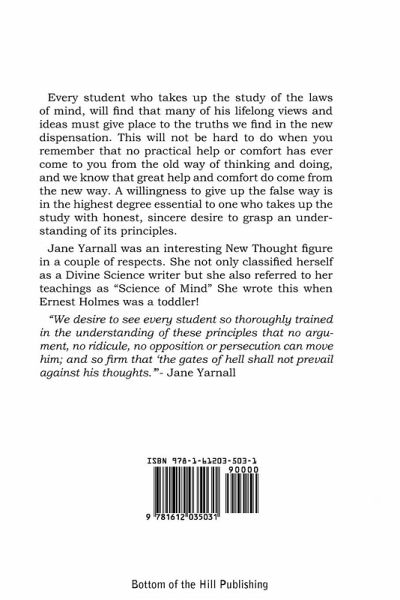 Every student who takes up the study of the laws of mind, will find that many of his lifelong views and ideas must give place to the truths we find in the new dispensation. This will not be hard to do when you remember that no practical help or comfort has ever come to you from the old way of thinking and doing, and we know that great help and comfort do come from the new way. A willingness to give up the false way is in the highest degree essential to one who takes up the study with honest, sincere desire to grasp an understanding of its principles. Jane Yarnall was an interesting New Thought figure in a couple of respects. She not only classified herself as a Divine Science writer but she also referred to her teachings as "Science of Mind" She wrote this when Ernest Holmes was a toddler! "We desire to see every student so thoroughly trained in the understanding of these principles that no argument, no ridicule, no opposition or persecution can move him; and so firm that 'the gates of hell shall not prevail against his thoughts.'" - Jane Yarnall