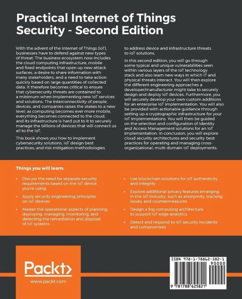 A practical, indispensable security guide that will navigate you through the complex realm of securely building and deploying systems in our IoT-connected world Key Features: - Learn best practices to secure your data from the device to the cloud - Use systems security engineering and privacy-by-design principles to design a secure IoT ecosystem - A practical guide that will help you design and implement cyber security strategies for your organization Book Description: With the advent of the Internet of Things (IoT), businesses have to defend against new types of threat. The business ecosystem now includes the cloud computing infrastructure, mobile and fixed endpoints that open up new attack surfaces. It therefore becomes critical to ensure that cybersecurity threats are contained to a minimum when implementing new IoT services and solutions. This book shows you how to implement cybersecurity solutions, IoT design best practices, and risk mitigation methodologies to address device and infrastructure threats to IoT solutions. In this second edition, you will go through some typical and unique vulnerabilities seen within various layers of the IoT technology stack and also learn new ways in which IT and physical threats interact. You will then explore the different engineering approaches a developer/manufacturer might take to securely design and deploy IoT devices. Furthermore, you will securely develop your own custom additions for an enterprise IoT implementation. You will also be provided with actionable guidance through setting up a cryptographic infrastructure for your IoT implementations. You will then be guided on the selection and configuration of Identity and Access Management solutions for an IoT implementation. In conclusion, you will explore cloud security architectures and security best practices for operating and managing cross-organizational, multi-domain IoT deployments. What You Will Learn: - Discuss the need for separate security requirements and apply security engineering principles on IoT devices - Master the operational aspects of planning, deploying, managing, monitoring, and detecting the remediation and disposal of IoT systems - Use Blockchain solutions for IoT authenticity and integrity - Explore additional privacy features emerging in the IoT industry, such as anonymity, tracking issues, and countermeasures - Design a fog computing architecture to support IoT edge analytics - Detect and respond to IoT security incidents and compromises Who this book is for: This book targets IT Security Professionals and Security Engineers (including pentesters, security architects and ethical hackers) who would like to ensure the security of their organization's data when connected through the IoT. Business analysts and managers will also find this book useful. Table of Contents - A Brave New World - Vulnerabilities, Attacks and Countermeasures - Approaches to Secure Development - Secure Design of IoT Devices - Operational Security Life Cycle - Cryptographic Fundamentals for IoT Security Engineering - Identity and Access Management Solutions for the IoT - Mitigating IoT Privacy Concerns - Setting Up an IoT Compliance Monitoring Program - Cloud Security for the IoT - IoT Incident Response and Forensic Analysis