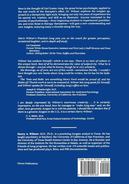 Here is the thought of Carl Gustav Jung, the great Swiss psychologist, applied to the real world of the therapist's office. Dr. Wilmer explores the Jungian approach in a deceptively light style, bringing not only his years of experience but his special wit, wisdom, and skill as an illustrator. Anyone interested in the process of psychotherapy-from beginning students to experienced practitioners, and even those in therapy themselves-will gain a new understanding and new insights, enjoying many a chuckle along the way. Harry Wilmer's Practical Jung puts you on the couch for greater perception, occasional laughter, and in-depth self-study. - Liz Carpenter, Former White House Executive Assistant and First Lady's Staff Director and Press Secretary; Wilmer has outdone himself-which is not easy. There is no taint of cultism in this unique book. Best of all he demonstrates the value of subjectivity. What he is shines through-not just what he knows, though he is very scholarly. His drawings, as of yore, are out of this world-sometimes literally. I wouldn 't have thought any new books about Jung could be written, but he has hit the bullseye. The 'Nuts and Bolts' are something Henry Ford would be proud of, and his [Rules of] Thumb work is not to be sneezed at. Wilmer lets Jung speak for himself, and Wilmer speaks for himself, including Jung's effect on him. - Joseph B. Wheelwright, M.D., Former President, International Association for Analytical Psychology, Professor Emeritus, University of California, San Francisco I am deeply impressed by Wilmer's enormous creativity . . . . It is certainly impressive, on the one hand, how he manages to "make Jung easy" and, on the other, how genuinely Jungian he is with his patients. I should like to declare that if there is a genuine Jungian in the U.S., it is a certain Harry Wilmer. - C. A. Meier, M.D., Professor Emeritus, Swiss Federal Institute of Technology, Zurich Harry A. Wilmer, M.D., Ph.D., is a Jungian analyst in Texas. He has taught psychiatry at Stanford, the University of California at San Francisco, and the University of Texas Health Science Center in San Antonio. He is founder and director of the Institute for the Humanities at Salado, as well as organizer of the Friends of Jung programs. He has written over 170 scientific books and publications and has produced plays, films, and PBS documentaries.