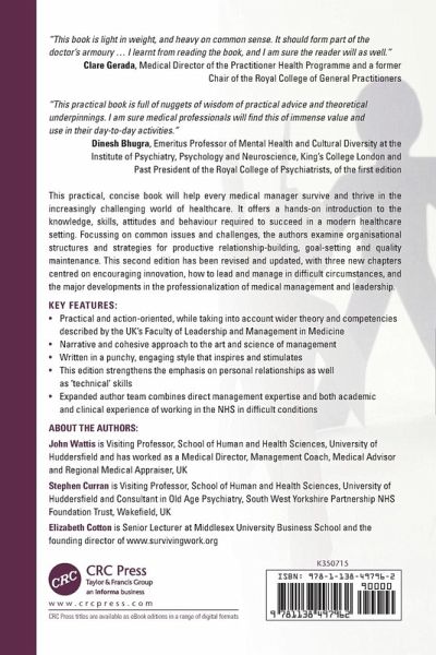 John Wattis is Professor of Old Age Psychiatry, University of Huddersfield. John was full time Medical Director for Leeds Community and Mental Health NHS Trust from 1995-99. He also held senior offices within the Faculty for Old Age Psychiatry of the Royal College of Psychiatrists. He has been R&D director for several NHS trusts. Before his retirement from his consultant post in the NHS, he trained as a business and life coach. Since then he has continued in his visiting university post, lecturing various student groups and supporting research. He has taught basic and advanced coaching skills to psychiatrists through the Royal College of Psychiatrists Education and Training Centre, and coached several NHS, university and voluntary sector staff, mostly in senior management positions. He has also acted for several years as part-time medical director (mental health) to two primary care trusts and continues to give medical management support on an ad hoc basis to these trusts. Stephen Curran is Professor of Old Age Psychiatry, University of Huddersfield (UK) and Consultant in Old Age Psychiatry, South West Yorkshire Partnership NHS Foundation Trust, Wakefield. Stephen trained in Leeds and worked as Lecturer in Old Age Psychiatry at the University of Leeds until he took up his current post as Consultant in Old Age Psychiatry in Wakefield in 1998. His primary clinical role is focused on the acute in-patient service for older people and he is also Lead Clinician for the Wakefield Memory Service. Since his appointment, Stephen has had several medical management roles including Programme Director, Head of Service and Clinical Lead. Since October 2017 he has been the Associate Medical Director for Postgraduate Medical Education. Stephen has contributed to significant changes in the organisation including service development and changes to the medical management arrangements. He also has considerable practical experience of dealing with the many management issues that arise in a busy old age psychiatry service including job planning, appraisal, quality improvements, change management and dealing with complaints, conflicts and the pressures caused by limited resources. Elizabeth Cotton is a writer and educator working in the field of mental health at work. Her background is in workers' education and international development. She has worked in over 35 countries on diverse issues such as HIV/AIDS, organising and building grassroots networks, negotiating and bargaining with employers as head of education for Industriall, one of the largest trade unions in the world, reflected in her book Global Unions Global Business (Libri Publishers). She teaches and writes academically at Middlesex University about employment relations and precarious work. She is Editor-in-Chief of an ABS4 journal, Work, Employment & Society, looking at the sociology of work. She blogs as www.survivingwork.org to a network of 30,000 people. In 2017, she published the largest national survey about working conditions in mental health, www.thefutureoftherapy.org. She set up www.survivingworkinhealth.org as a free resource in partnership with the Tavistock and Portman NHS Foundation Trust. Her current book, Surviving Work in Healthcare: Helpful stuff for people on the frontline (Gower, 2017), was nominated for the Chartered Management Institute's practitioner book of the year.
