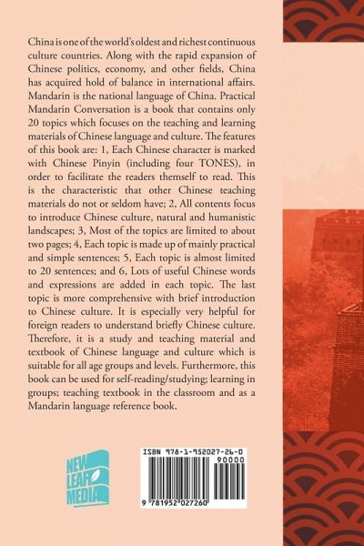 China is one of the world's oldest and richest continuous culture countries. Along with the rapid expansion of Chinese politics, economy, and other fields, China has acquired hold of balance in international affairs. Mandarin is the national language of China. Practical Mandarin Conversation is a book that contains only 20 topics which focuses on the teaching and learning materials of Chinese language and culture. The features of this book are: 1, Each Chinese character is marked with Chinese Pinyin (including four TONES), in order to facilitate the readers them self to read. This is is the characteristic that other Chinese teaching materials do not or seldom have; 2, All contents focus to introduce Chinese culture, natural and humanistic landscapes; 3, Most of the topics are limited to about two pages; 4, Each topic is made up of mainly practical and simple sentences; 5, Each topic is almost limited to 20 sentences; and 6, Lots of useful Chinese words and expressions are added in each topic. The last topic is more comprehensive with brief introduction to Chinese culture. It is especially very helpful for foreign readers to understand briefly Chinese culture. Therefore, it is a study and teaching material and textbook of Chinese language and culture which is suitable for all age groups and levels. Furthermore, this book can be used for self-reading/studying; learning in groups; teaching textbook in the classroom and as a Mandarin language reference book.