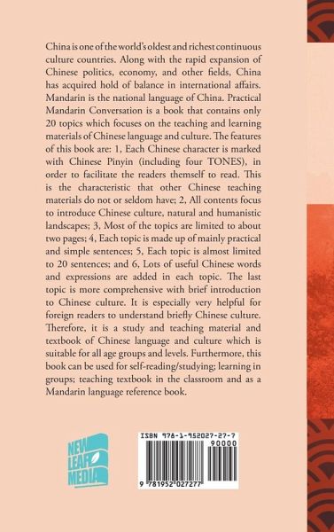 China is one of the world's oldest and richest continuous culture countries. Along with the rapid expansion of Chinese politics, economy, and other fields, China has acquired hold of balance in international affairs. Mandarin is the national language of China. Practical Mandarin Conversation is a book that contains only 20 topics which focuses on the teaching and learning materials of Chinese language and culture. The features of this book are: 1, Each Chinese character is marked with Chinese Pinyin (including four TONES), in order to facilitate the readers them self to read. This is is the characteristic that other Chinese teaching materials do not or seldom have; 2, All contents focus to introduce Chinese culture, natural and humanistic landscapes; 3, Most of the topics are limited to about two pages; 4, Each topic is made up of mainly practical and simple sentences; 5, Each topic is almost limited to 20 sentences; and 6, Lots of useful Chinese words and expressions are added in each topic. The last topic is more comprehensive with brief introduction to Chinese culture. It is especially very helpful for foreign readers to understand briefly Chinese culture. Therefore, it is a study and teaching material and textbook of Chinese language and culture which is suitable for all age groups and levels. Furthermore, this book can be used for self-reading/studying; learning in groups; teaching textbook in the classroom and as a Mandarin language reference book.