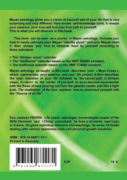 Mayan astrology gives you a vision of yourself and of your life that is very surprising and very different from known self-knowledge tools. It reveals your essence, your true self and your true path to yourself. This is what you will discover in this book. This book can be seen as a course in Mayan astrology. It shows you how to easily calculate your Mayan ¿identity glyph¿ and your Mayan chart. It then shows you how to interpret them by yourself according to three calendars: > The ¿thirteen moon¿ calendar > The ¿traditional¿ calendar based on the GMT 584283 constant. > The traditional calendar based on the VMR 774080 constant. Mayan astrology as taught in this book describes your « Maya Cross », which summarizes your essence and your life project. It then describes the main intention of your life followed by the sacred path, in thirteen steps, to return to the center of yourself, so as to become reconnected with the flows of love pouring out from the galactic center, just like a light bulb. The meditation of the Sun explains how to reconnect yourself with the ¿Source of all life¿.