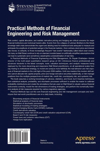 In Practical Methods of Financial Engineering and Risk Management , Dr. Rupak Chatterjee - former director of the multi-asset quantitative research group at Citi - introduces finance professionals and advanced students to the latest concepts, tools, valuation techniques, and analytic measures being deployed by the more discerning and responsive Wall Street practitioners, on all operational scales from day trading to institutional strategy, to model and analyze more faithfully the real behavior and risk exposure of financial markets in the cold light of the post-2008 realities. Until one masters this modern skill set, one cannot allocate risk capital properly, price and hedge derivative securities realistically, or risk-manage positions from the multiple perspectives of market risk, credit risk, counterparty risk, and systemic risk.