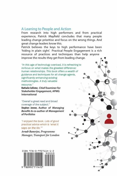 From research into high performers and from his own experience, Patrick Mayfield concludes that many of us leading change have prioritised and focused on the wrong things. Great change leaders understand this. Could their focus and different behaviours be the reason for their achievements? Patrick believes the evidence has been 'hiding in plain sight'. Practical People Engagement provides a better approach as well as a rich source of practices and techniques that help the reader get better results from the change they are trying to lead. As well as challenging conventional perspectives and practices on the 'people thing', Patrick provides a better way, observed in the high performers, identifying seven timeless principles of people engagement. The book considers different perspectives, 'hats', on stakeholders, story-telling as a key vehicle of engagement, how Agile relates to good engagement, the leader's favourite word, and the power of collaboration. The main and final section distills the various practices and techniques into a simple five-step pathway. Whilst writing, Patrick applied the principles and practices in this book to the book itself, collaborating with a large number of specialists in related fields. As a result, 'Practical People Engagement' has now been chosen as the source reference for a new APMG International qualification in Stakeholder Engagement. "Readable, practical and written from a sound research base." Mark Withers, CIPD and Mightywaters Consulting. "Any Agile project needs to put significant effort into the way team members communicate but the most successful of those will also employ many of Patrick's tips to communicate most effectively with all who should be involved." Julia Godwin, DSDM Director. "Overall a great read and broad coverage of the subject." Stephen Jenner, author of 'Managing Benefits'.