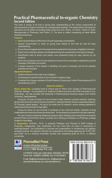 The book is unique of its kind in giving clear understanding of the various experiments of pharmaceutical inorganic chemistry for undergraduate students. The experiments in the book are planned to suit all Indian Universities syllabi at the level of D. Pharm., B. Pharm., Post-Baccalaureate of Pharmacy and Pharm. D. The book is written considering all latest official standard procedures. Features Most important feature of the book is its self-explanatory presentation Special concentration is made on giving clear details of limit test for lead for easy understanding Every chemical reagent used in the experiment is explained for its purpose, a highlight in the book Experiments relating to assays were designed taking into consideration of all types of assays Identification tests of anions and cations were presented lucidly for easy memory by the students Semi-micro analysis is new for even teachers in some of the universities. A detailed lay out and necessary information is included A proper exposure of the student in handling viva-voce is necessary and all the possible questions are included. Appended Features Additional Experiments Under every Category. Emphasized on specific test for purity of certain in-organic drugs. Complied list of Assay methods of small Molecule Drugs as per Indian Pharmacopoeia-2014.