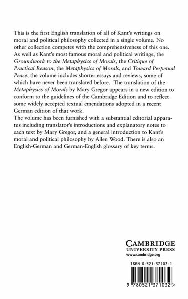 This is the first English translation of all of Kant's writings on moral and political philosophy collected in a single volume. No other collection competes with the comprehensiveness of this one. As well as Kant's most famous moral and political writings, the Groundwork of the Metaphysics of Morals, the Critique of Practical Reason, the Metaphysics of Morals, and Toward Perpetual Peace, the volume includes shorter essays and reviews, some of which have never been translated before. The translation of the Metaphysics of Morals by Mary Gregor appears in a new edition to conform to the guidelines of the Cambridge Edition and to reflect some widely accepted textual emendations adopted in a recent German edition of that work. The volume has been furnished with a substantial editorial apparatus including translators' introductions and explanatory notes to each text, and a general introduction to Kant's moral and political philosophy by Allen Wood. There is also an English-German and German-English glossary of key terms.
