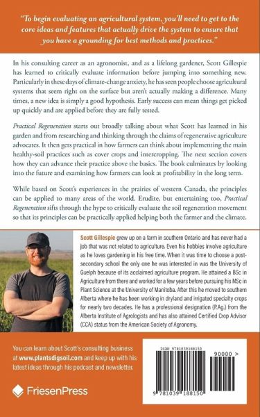 "To begin evaluating an agricultural system, you'll need to get to the core ideas and features that actually drive the system to ensure that you have a grounding for best methods and practices." In his consulting career as an agronomist, and as a lifelong gardener, Scott Gillespie has learned to critically evaluate information before jumping into something new. Particularly in these days of climate-change anxiety, he has seen people choose agricultural systems that seem right on the surface but aren't actually making a difference. Many times, a new idea is simply a good hypothesis. Early success can mean things get picked up quickly and are applied before they are fully tested. Practical Regeneration starts out broadly talking about what Scott has learned in his garden and from researching and thinking through the claims of regenerative agriculture advocates. It then gets practical in how farmers can think about implementing the main healthy-soil practices such as cover crops and intercropping. The next section covers how they can advance their practice above the basics. The book culminates by looking into the future and examining how farmers can look at profitability in the long term. While based on Scott's experiences in the prairies of western Canada, the principles can be applied to many areas of the world. Erudite, but entertaining too, Practical Regeneration sifts through the hype to critically evaluate the soil regeneration movement so that its principles can be practically applied helping both the farmer and the climate.