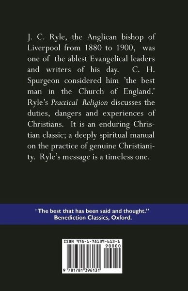 J. C. Ryle, Anglican bishop of Liverpool from 1880 to 1900, was one of the ablest Evangelical leaders and writers of his day. C. H. Spurgeon considered him 'the best man in the Church of England.' Ryle's "Practical Religion" discusses the duties, dangers and experiences of Christians. It is an enduring Christian classic, a deeply spiritual manual on the practice of genuine Christianity. Ryle's message is a timeless one.