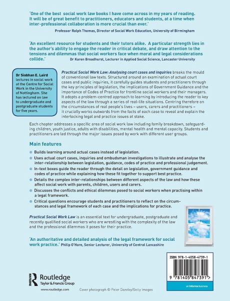 Practical Social Work Law: analysing court cases and inquiries presents legal issues associated with social work in an accessible format. It approaches the law in a way that is less daunting and more engaging by examining actual court cases and public inquiries, and explores the stories of real people and the legal and ethical dilemmas practitioners will face. The text adopts a problem-centred approach to learning by introducing the reader to key aspects of the law through a series of real-life situations; it addresses basic principles regarding the operation of the law and explores the lessons for good practice. Each chapter addresses a specific area of social work law including family breakdown, safeguarding children, youth justice, adults with disabilities, mental health and mental capacity. Landmark cases, cases drawn from the lower courts, tribunals, and ombudsman's decisions are included throughout presenting an accessible account of the application of the law. Practical Social Work Law is an essential text for undergraduate, postgraduate and recently qualified social workers who are wrestling with the complexity of the law and the professional dilemmas it poses for their practice."This book is unusual for a law book in that it is not only a reference book but also a very readable volume...[It] is set out clearly and provides a sound basis for student social workers new to the law and a refresher for qualified practitioners." Catherine Poulter. RSW. Integrated Community Services. Carmarthenshire County Council