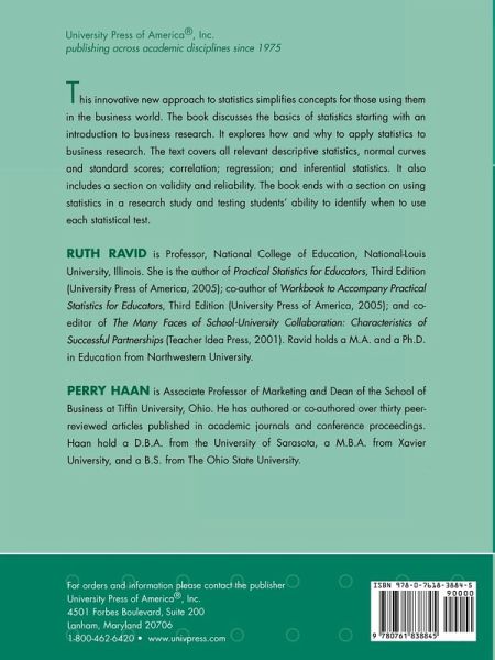 This innovative new approach to statistics simplifies concepts for those using them in the business world. The book discusses the basics of statistics starting with an introduction to business research. It explores how and why to apply statistics to business research. The text covers all relevant descriptive statistics, normal curves and standard scores; correlation; regression; and inferential statistics. It also includes a section on validity and reliability. The book ends with a section on using statistics in a research study and testing students' ability to identify when to use each statistical test.