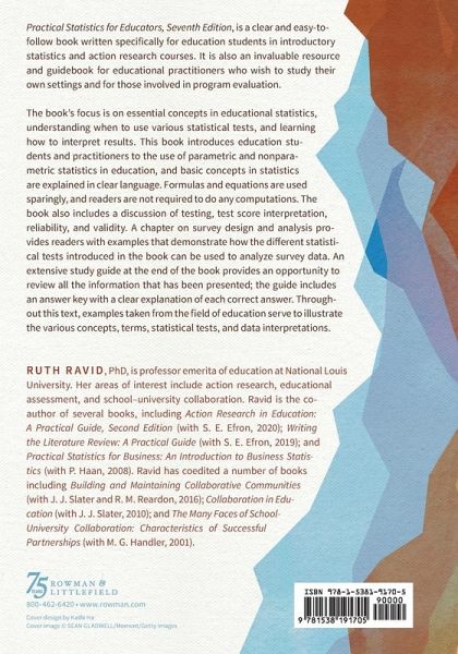 Practical Statistics for Educators, Seventh Edition, is a clear and easy-to follow book written specifically for education students in introductory statistics and action research courses. It is also an invaluable resource and guidebook for educational practitioners who wish to study their own settings and for those involved in program evaluation. The book’s focus is on essential concepts in educational statistics, understanding when to use various statistical tests, and learning how to interpret results. This book introduces education students and practitioners to the use of parametric and nonparametric statistics in education, and basic concepts in statistics are explained in clear language. Formulas and equations are used sparingly, and readers are not required to do any computations. The book also includes a discussion of testing, test score interpretation, reliability, and validity. A chapter on survey design and analysis provides readers with examples that demonstrate how the different statistical tests introduced in the book can be used to analyze survey data. An extensive study guide at the end of the book provides an opportunity to review all the information that was presented in the book; the guide includes an answer key with a clear explanation of each correct answer. Throughout this text, examples taken from the field of education serve to illustrate the various concepts, terms, statistical tests, and data interpretations.