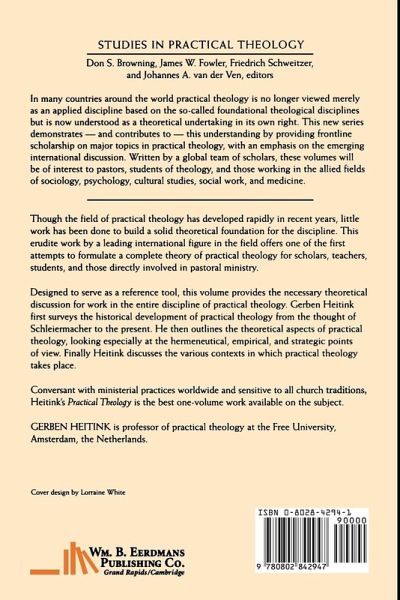 Though the field of practical theology has developed rapidly in recent years, little work has been done to build a solid theoretical foundation for the discipline. This erudite work by a leading international figure in the field offers one of the first attempts to formulate a complete theory of practical theology for scholars, teachers, students, and those directly involved in pastoral ministry. Designed to serve as a reference tool, this volume provides the necessary theoretical discussion for work in the entire discipline of practical theology. Gerben Heitink first surveys the historical development of practical theology from the thought of Schleiermacher to the present. He then outlines the theoretical aspects of practical theology, looking especially at the hermeneutical, empirical, and strategical points of view. Finally Heitink discusses the various contexts in which practical theology takes place. Conversant with ministerial practices worldwide and sensitive to all church traditions, Heitink's Practical Theology is the best one-volume work available on the subject.