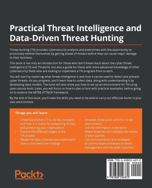 Get to grips with cyber threat intelligence and data-driven threat hunting while exploring expert tips and techniques Key Features:Set up an environment to centralize all data in an Elasticsearch, Logstash, and Kibana (ELK) server that enables threat hunting Carry out atomic hunts to start the threat hunting process and understand the environment Perform advanced hunting using MITRE ATT&CK Evals emulations and Mordor datasets Book Description: Threat hunting (TH) provides cybersecurity analysts and enterprises with the opportunity to proactively defend themselves by getting ahead of threats before they can cause major damage to their business. This book is not only an introduction for those who don't know much about the cyber threat intelligence (CTI) and TH world, but also a guide for those with more advanced knowledge of other cybersecurity fields who are looking to implement a TH program from scratch. You will start by exploring what threat intelligence is and how it can be used to detect and prevent cyber threats. As you progress, you'll learn how to collect data, along with understanding it by developing data models. The book will also show you how to set up an environment for TH using open source tools. Later, you will focus on how to plan a hunt with practical examples, before going on to explore the MITRE ATT&CK framework. By the end of this book, you'll have the skills you need to be able to carry out effective hunts in your own environment. What You Will Learn:Understand what CTI is, its key concepts, and how it is useful for preventing threats and protecting your organization Explore the different stages of the TH process Model the data collected and understand how to document the findings Simulate threat actor activity in a lab environment Use the information collected to detect breaches and validate the results of your queries Use documentation and strategies to communicate processes to senior management and the wider business Who this book is for: ¿If you are looking to start out in the cyber intelligence and threat hunting domains and want to know more about how to implement a threat hunting division with open-source tools, then this cyber threat intelligence book is for you.