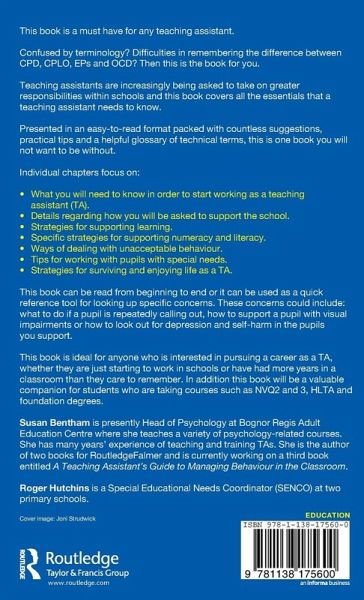 Susan Bentham is presently Head of Psychology at Bognor Regis Community College Adult Education where she teaches a variety of Psychology related courses. She has many yearsâEUR(TM) experience of teaching and training Teaching Assistants. She is the author of two books for RoutledgeFalmer and is currently working on a third book entitled A Teaching AssistantâEUR(TM)s Guide to Managing Behaviour in the Classroom. Roger Hutchins is a Special Educational Needs Co-ordinator (Senco) at two Primary Schools.