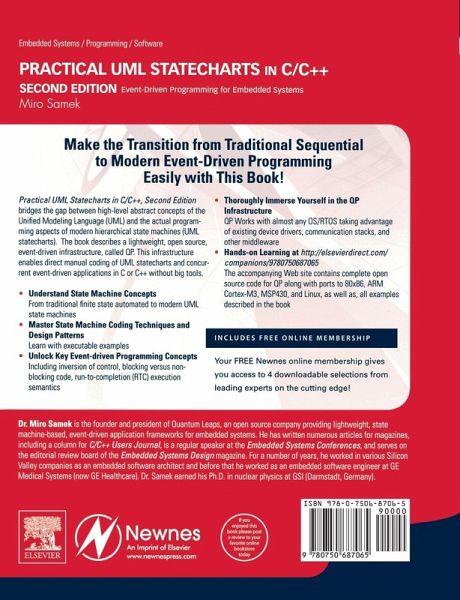 Preface PART I STATECHARTS Chapter 1 Whirlwind Tour of Programming with Statecharts1.1 Why Bother?1.2 The Traditional Event-Action Paradigm1.3 State Machines ? A Better Way of Programming1.3.1 The Time Bomb Example1.3.2 The Calculator Example1.5 Object-Oriented Analogy1.6 The Event-driven Framework1.6 SummaryChapter 2 A Crash Course in Statecharts 2.1 The Essence of Finite State Machines2.2 The Essence of UML Statecharts2.3 Examples of State Models2.4 SummaryChapter 3 Standard State Machine Implementations3.1 State Machine Interface3.2 Nested switch Statement3.3 State Table3.4 State Design Pattern3.5 Optimal FSM Implementation3.6 State Machines and C++ Exception Handling 3.7 Role of Pointer-to-Member Functions3.8 Implementing Guards, Junctions, and Choice Points3.9 Implementing Entry and Exit Actions3.10 Dealing with State Hierarchy3.11 SummaryChapter 4 QEP: A Minimal Hierarchical Event Processor4.1 General Structure of the QEP Event Processor4.2 An Annotated Example (QHsm)4.3 QEP Structure4.3.1 QEP Source Code Structure4.3.2 Internal Representation of a State Machine4.3.3 Initialization of a State Machine4.3.4 Dispatching Events to a FSM4.3.5 Executing a Transition in a FSM4.3.6 Dispatching Events to a HSM4.3.7 Executing a Transition in a HSM4.3.8 Static Transition Optimization in a HSM4.4 Porting and Configuring QEP4.5 Caveats4.6 Su