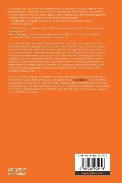 This project addresses the contexts of Practice as Research and how to undertake it. This second iteration updates thinking and practices but sustains a direct and clear approach on how to become a practitioner-researcher. New features include an extension of range "beyond" the arts and a case for intra-disciplinarity in Practice Research as an influence in the formation of the "future university". A comparison is made between Artistic Research and Practice Research recognizing that research through practices with being-doing-knowing is central to both. Acknowledging the current crisis in legitimation, a broad view is taken of how things might be known by an onto-epistemology for the twenty-first century foregrounding the bodymind but sustaining rationality and community by way of Other/other dialogic exchange. Perspectives from around the world in Part II offset the more Eurocentric emphasis in Part I.