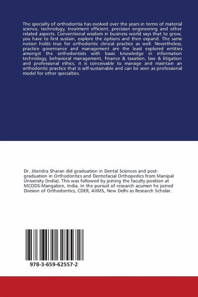 The specialty of orthodontia has evolved over the years in terms of material science, technology, treatment efficient, precision engineering and other related aspects. Conventional wisdom in business world says that to grow, you have to first sustain, explore the options and then expand. The same notion holds true for orthodontic clinical practice as well. Nevertheless, practice governance and management are the least explored entities amongst the orthodontists with basic knowledge in information technology, behavioral management, finance & taxation, law & litigation and professional ethics, it is conceivable to manage and maintain an orthodontic practice that is self-sustainable and can be seen as professional model for other specialties.