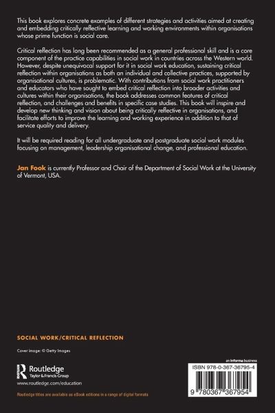 Critical reflection has long been recommended as a general professional skill and is a core component of the practice capabilities in social work in countries across the Western world. However, despite unequivocal support for it in social work education, sustaining critical reflection within organisations as both an individual and collective practices, supported by organisational cultures, is problematic. With contributions from social work practitioners and educators who have sought to embed critical reflection into broader activities and cultures within their organizations, the book addresses common features of critical reflection, and challenges and benefits in specific case studies. This book will inspire and develop new thinking and vision aboutbeing critically reflective in organisations, and facilitate efforts to improve the learning and working experience in addition to that of service quality and delivery.