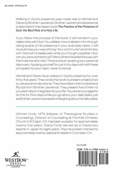 Walking in God’s presence was made real to Michell and Diane by Brother Lawrence. Brother Lawrence’s experience is described in the classic book The Practice of the Presence of God: the Best Rule of a Holy Life. If you follow the process of this book, it will transform your relationship with God. You will learn how to abide in Him through being aware of His presence in your everyday tasks. It will revolutionize your way of living. Your communion and intimacy with God will increase past what you thought possible. How can you be sure this is true? Many others have led the way with their lives transformed. This is a lost art awaiting your personal discovery. Applying yourself for just thirty days will instill these principles into your heart, never to be lost. Michell and Diane have walked in God’s presence for over thirty-five years. They wrote this book to present a helpful tool to use as a short devotional. They have taken one hundred and fifty tips from Brother Lawrence. They present five of them to you each day to integrate into your life. You are encouraged to do this for thirty days while you go about your daily tasks, just as Brother Lawrence prayed while going about his daily tasks.