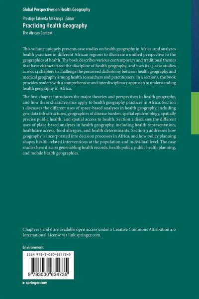 This volume uniquely presents case studies on health geography in Africa, and analyzes health practices in different African regions to illustrate a unified perspective to the geographies of health. The book describes various contemporary and traditional themes that have characterized the discipline of health geography, and uses its 13 case studies across 14 chapters to challenge the perceived dichotomy between health geography and medical geography among health researchers and practitioners. In 3 sections, the book provides readers with a comprehensive and interdisciplinary approach to understanding health geography in Africa.