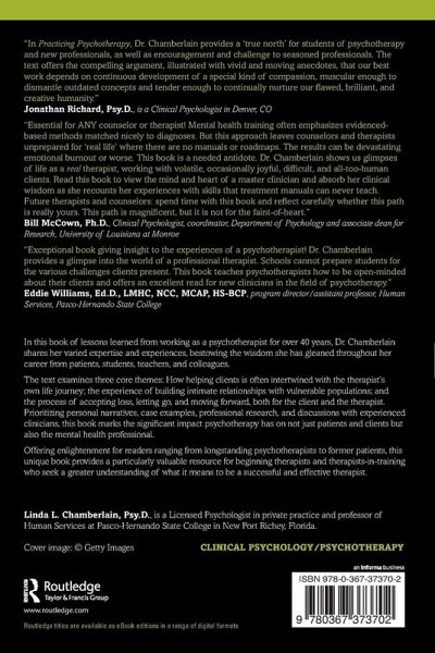 Essential book for ANYONE who wants to be-or is- a counselor or therapist! Contemporary mental health training often emphasizes evidenced-based methods matched nicely to diagnoses. It often looks so easy. But this highly structured approach often leaves counselors and therapists unprepared for life "out there" where there are no manuals or roadmaps. The results can be devastating emotional burnout or much worse. This book may be just the needed antidote. Dr. Chamberlain shows us glimpses of life as a real therapist, working with volatile, occasionally joyful, difficult, sometimes ungrateful, and all-too-human clients. Read this book to view the mind and heart of a master clinician as she recounts her journey across the lifespan, with skills that treatment manuals can never teach. Read it again to absorb the clinical wisdom on each page. But most of all, if you believe therapy is your calling, you need to spend time with this book and reflect carefully whether this path is really yours. This lifetime journey is magnificent, but it is not for the faint-of-heart.