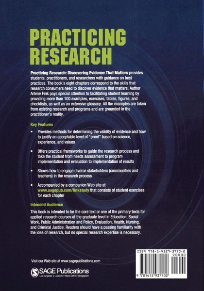 Practicing Research: Discovering Evidence That Matters provides research consumers with the skills necessary for discovering evidence that matters.This book is designed for students, practitioners or researchers who are planning to review research for best practices or are actually selecting programs right now. Author Arlene Fink assumes that each person who reads it has a passing familiarity with the idea of research, but no special research expertise is necessary. The book has eight chapters corresponding to the skills that research consumers need to discover evidence that matters. Fink pays special attention to facilitating student learning by providing over a hundred examples, flowcharts, tables, and checklists as well as an extensive glossary. (Students who are interested in any specific topic can further their knowledge by using the related website, which contains links to other sites as well as additional examples and exercises). All the examples are taken from existing research and programs and grounded in the practitioner's reality. Key Features: Provides methods for determining the validity of evidence and how to justify an acceptable level of "proof" based on science, experience, and values Offers practical frameworks to guide the research process and which take the student from needs assessment to program implementation and evaluation through to implementation of results. Shows how to engage diverse stakeholders (communities, teachers) in the research process Contains an Instructor's Resources CD with supplemental studies and exercises for students; some of the studies and exercises are linked to studies on the internet so that students are required to practice the tools and concepts presented in the book.
