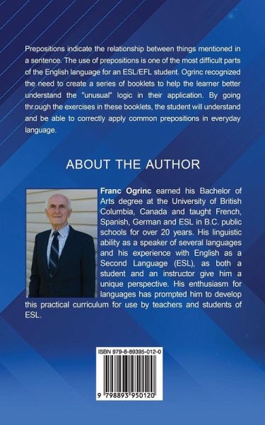 Prepositions indicate the relationship between things mentioned in a sentence. The use of prepositions is one of the most difficult parts of the English language for an ESL/EFL student. Ogrinc recognized the need to create a series of booklets to help the learner better understand the "unusual" logic in their application. By going through the exercises in these booklets, the student will understand and be able to correctly apply common prepositions in everyday language.